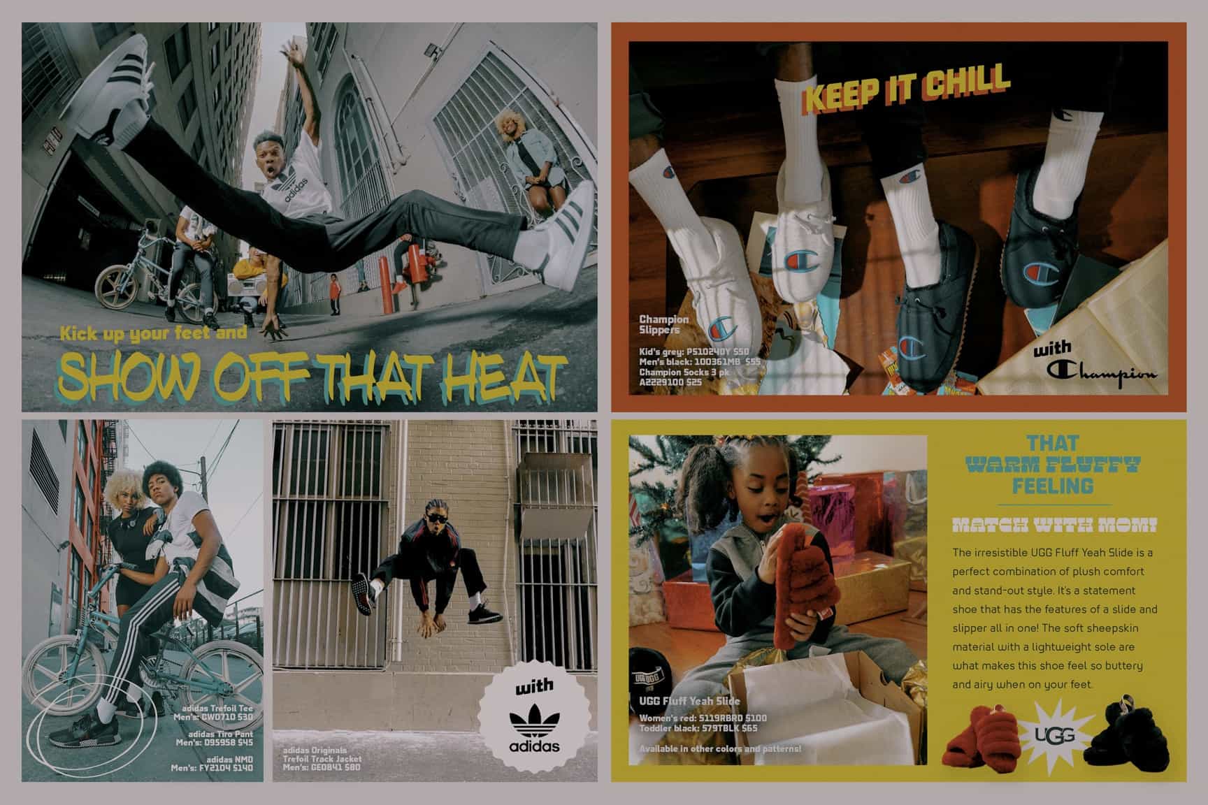 I designed a printed mailer magazine with touches of retro styles, bold illustrations, and digital collages to promote Footlocker's holiday campaign. This national project leaned on the vintage photography styles and textures to highlight the best-selling footwear of the season. It also included a library of digital assets for social promotion across Footlocker's accounts for both men, women, and kids.